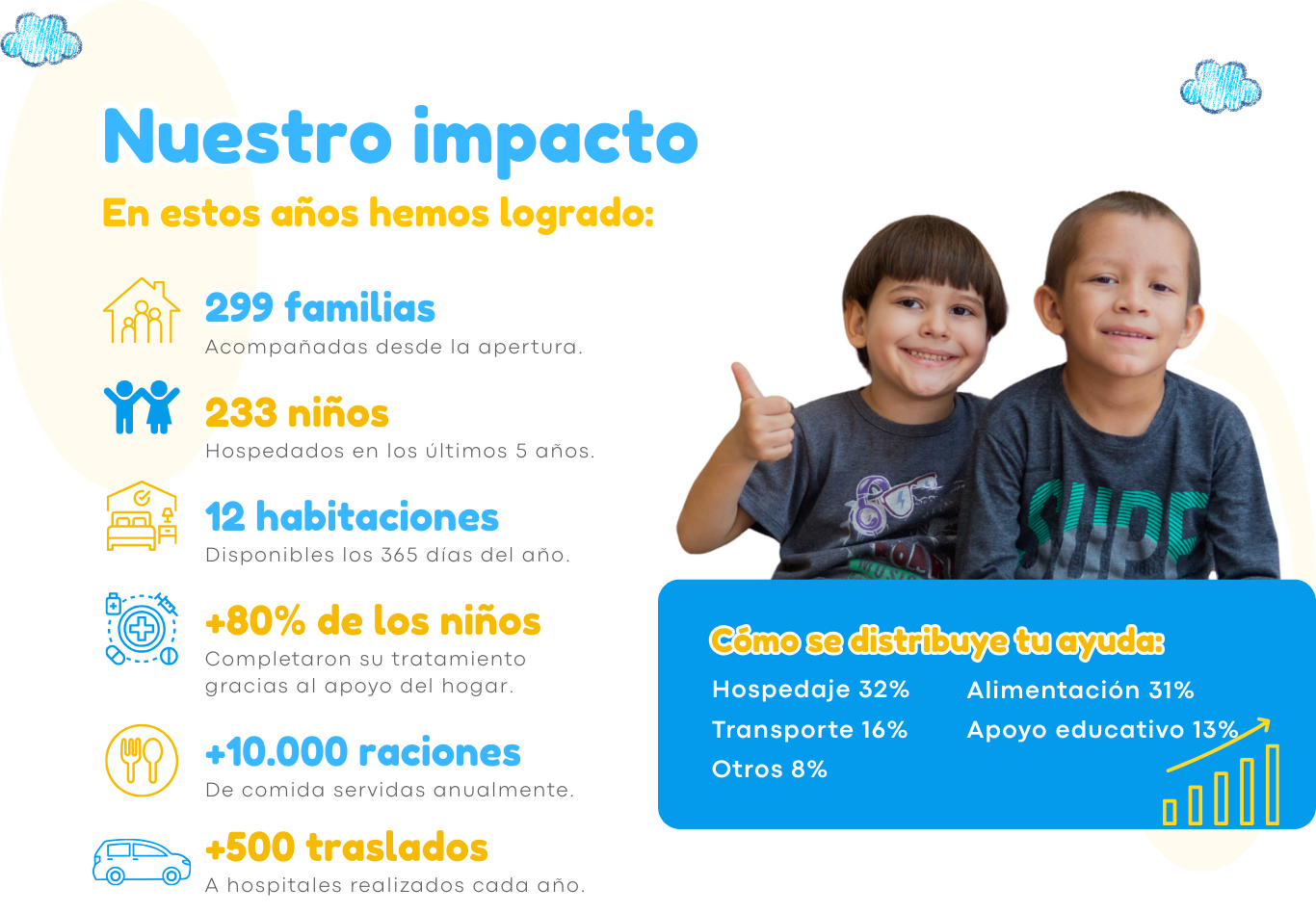 Ubicada en el barrio Modelo, la casa cuenta con 12 habitaciones y abre sus puertas los 365 días del año, brindando hospedaje, alimentación, transporte y apoyo académico, de manera totalmente gratuita al niño y su acompañante.